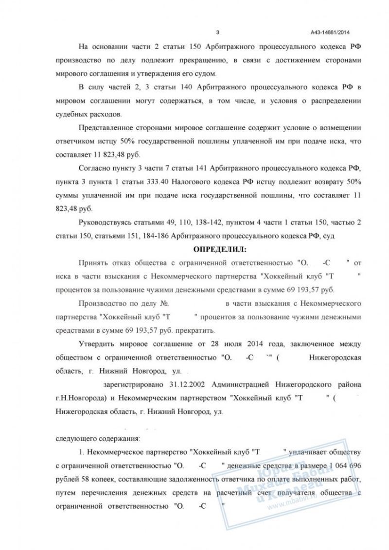 В результате переговорного процесса хоккейный клуб признал задолженность и в полном объёме перечислил ООО «О-С» 1 000 000 рублей. Поданный в суд иск завершился утверждением мирового соглашения, которое зафиксировало все достигнутые договорённости и гарантировало клиенту получение причитающихся средств.