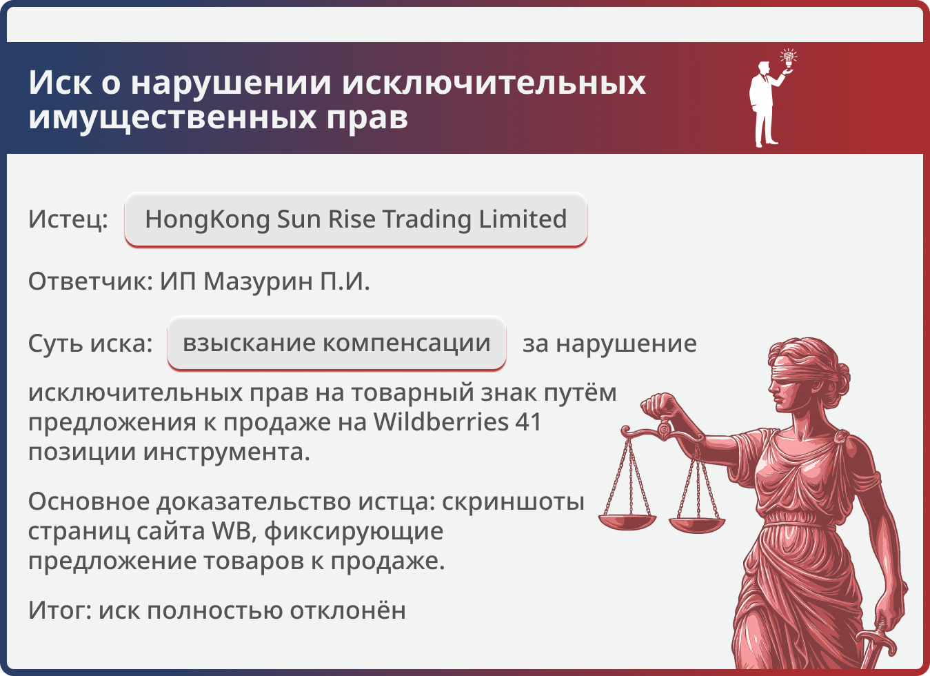 Иск подала гонконгская компания HongKong Sun Rise Trading Limited к пензенскому предпринимателю Мазурину П.И. В ходе рассмотрения дела суд по ходатайству ответчика перешёл от упрощённого производства к общим правилам искового производства и привлёк к участию двух третьих лиц: поставщика ответчика (ИП Рыгалова С.В.) и официального представителя бренда в России (ООО «Гринворкстулс Евразия»).