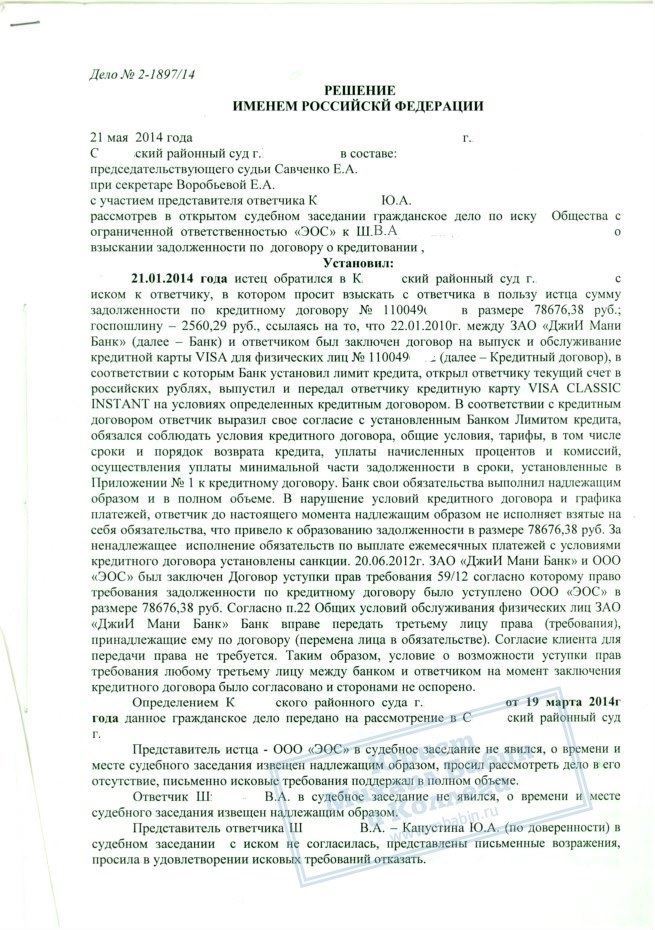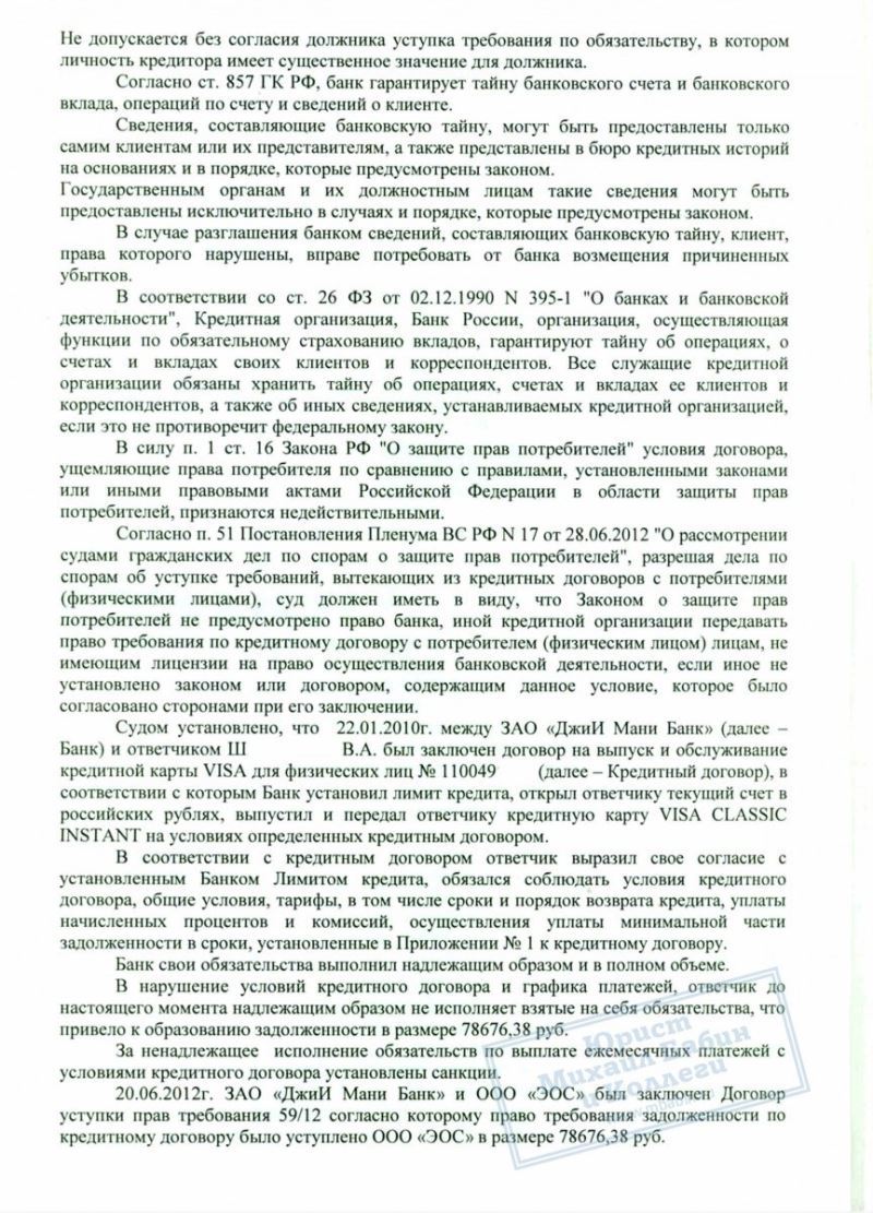 ЗАО «ДжиИ Мани Банк» передал права на взыскание непогашенной задолженности гражданина Ш. коллекторскому агентству ООО «ЭОС», которое подало на заемщика в суд.
