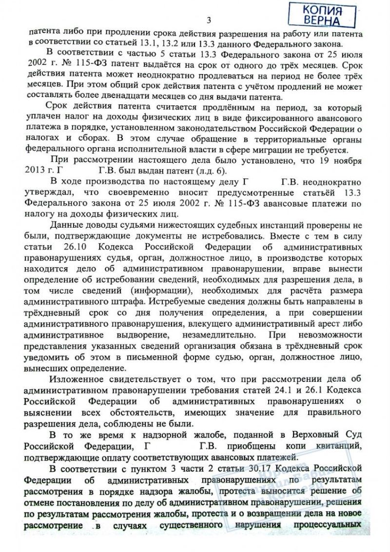 Адвокат, изучив дело, пришел к выводу, что Г. не нарушает закон, находясь на территории РФ, так как своевременной оплатой патента он обеспечил себе это право. Однако, в обоих случаях суд выносил вердикт, не принимая этот факт во внимание.