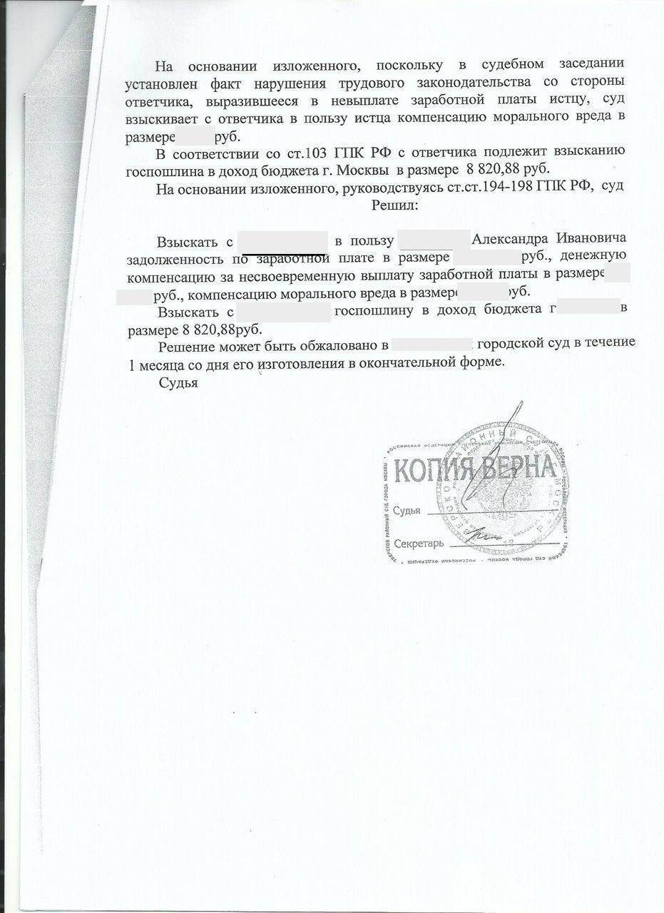 Суд, рассмотрев дело, решил удовлетворить исковые требования истца, обязав взыскать с ответчика (работодателя) задолженность по заработной плате, денежную компенсацию за несвоевременную выплату заработной платы и компенсировать моральный вред. Также суд постановил взыскать с ответчика госпошлину в размере 8 820 руб. 88 коп. в доход государства.