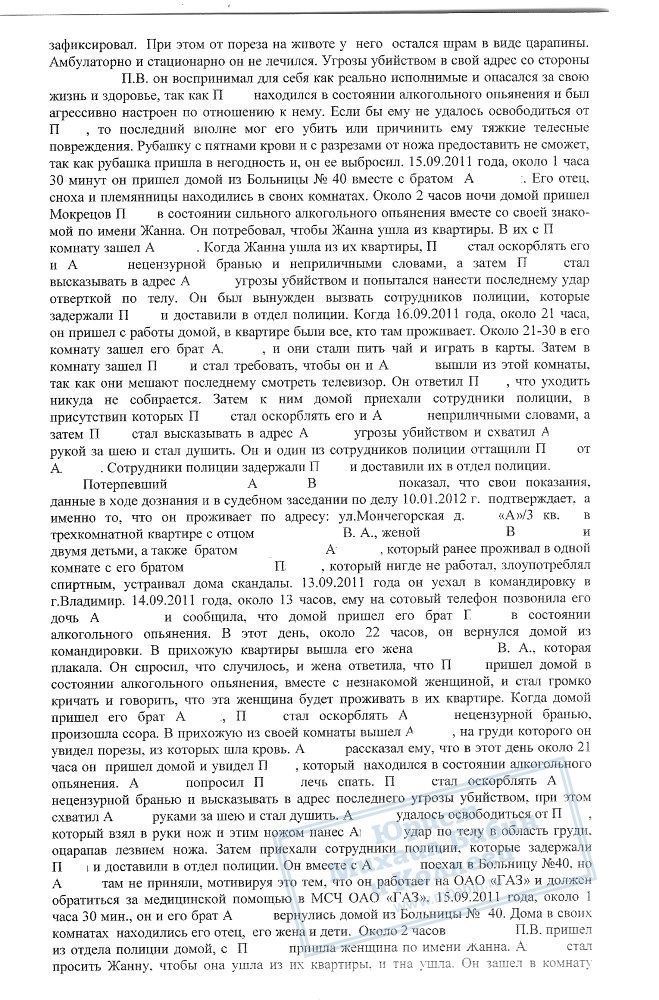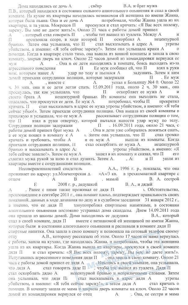 В августе 2013 года руководитель нашей компании проводил защиту по уголовному делу П.В., который неоднократно являлся инициатором конфликтов со своими родственниками на бытовой почве и с причинением вреда здоровью. Данный факт подтвержден всеми свидетелями и потерпевшими по делу, однако сторона обвинения изначально неверно квалифицировала деяния П.В.