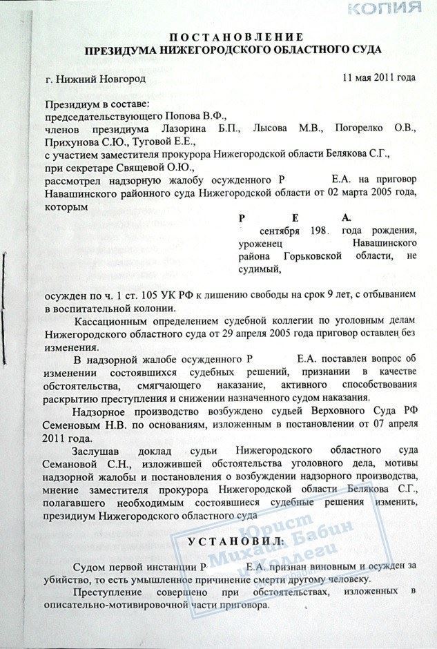 Р. был признан виновным в совершении преступления и осужден по ст. 105 УК РФ к лишению свободы сроком на 9 лет. Осужденный уже отбывал наказание более 6 лет, когда обратился за помощью к нашему адвокату. Адвокат подал в Верховный Суд РФ надзорную жалобу о пересмотре приговора в связи с неучтенными ранее смягчающими обстоятельствами.