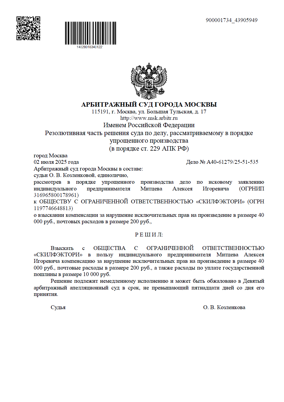 40 000 руб. компенсации за нарушение исключительных прав в споре со Skillfactory.