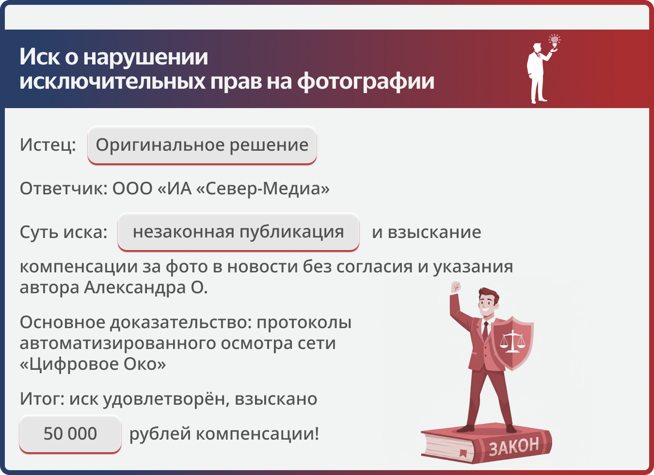 Нарушение было выявлено на крупном региональном новостном портале, принадлежащем ООО «Информационное агентство «Север-Медиа». Редакция использовала снимок для иллюстрации своей новости, не получив разрешения и не указав имя автора Александра О., что является прямым нарушением исключительных прав.