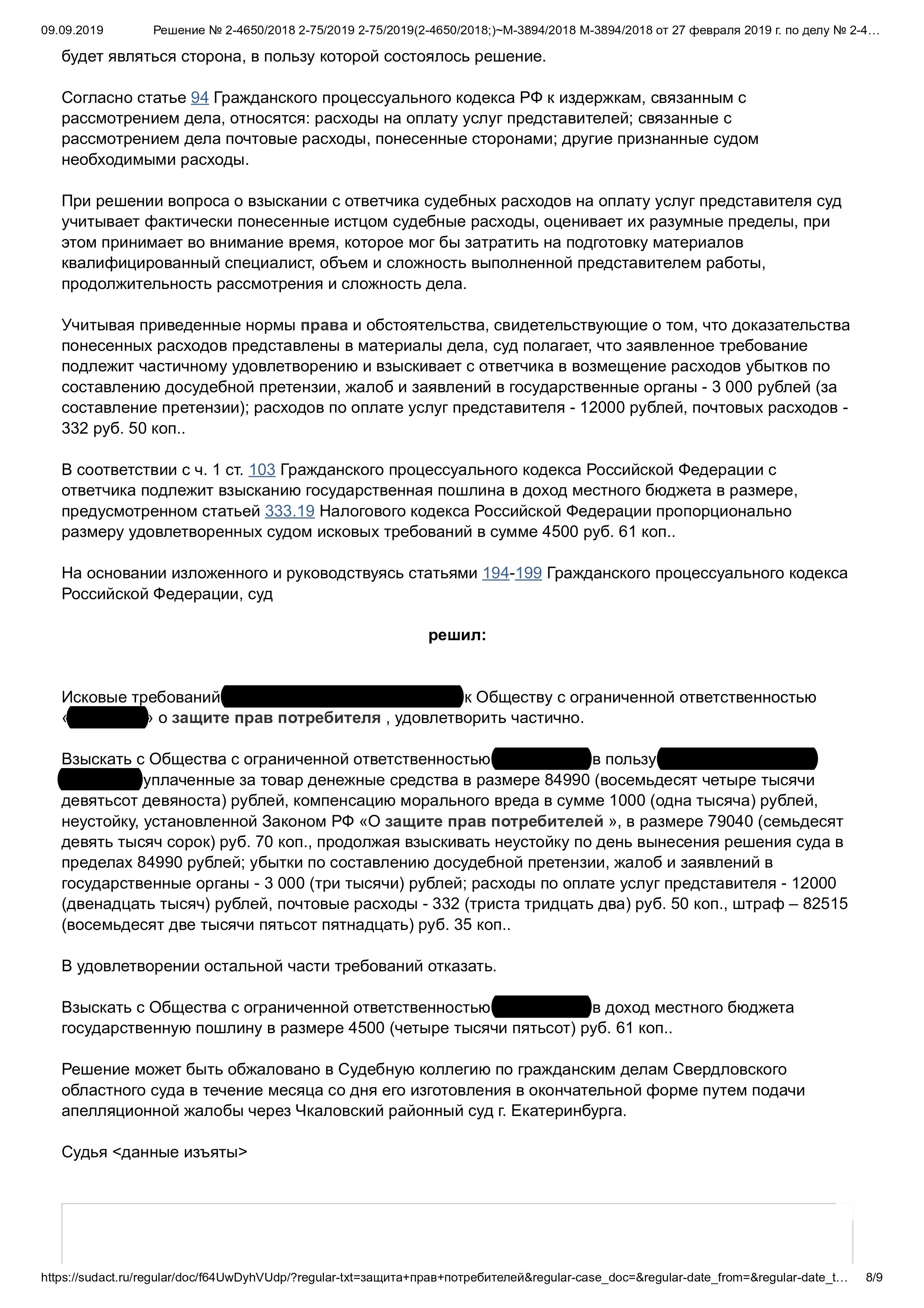Юристы нашей организации в целях разрешения конфликта направили претензию к продавцу, однако компания, в свою очередь, изложенные требования не удовлетворила. Чтобы защитить интересы клиента, наши специалисты обратились в суд с исковым заявлением о взыскании с недобросовестного продавца: стоимости товара, компенсации морального вреда, а также понесенных судебных расходов. В итоге, в пользу нашей клиентки была взыскана стоимость телевизора, компенсация морального вреда, неустойка, расходы по составлению досудебной претензии, жалоб и заявлений, оплате услуг представителя, почтовые расходы, а также сумма штрафа.