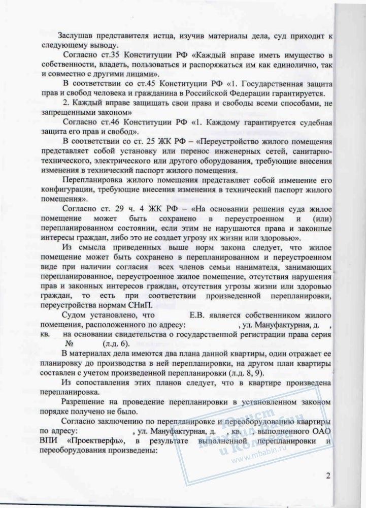 Юристами нашей компании был подготовлен необходимый комплект документов, включая технические, санитарные, противопожарные заключения. По решению суда квартира Е.В. была сохранена в перепланированном состоянии.